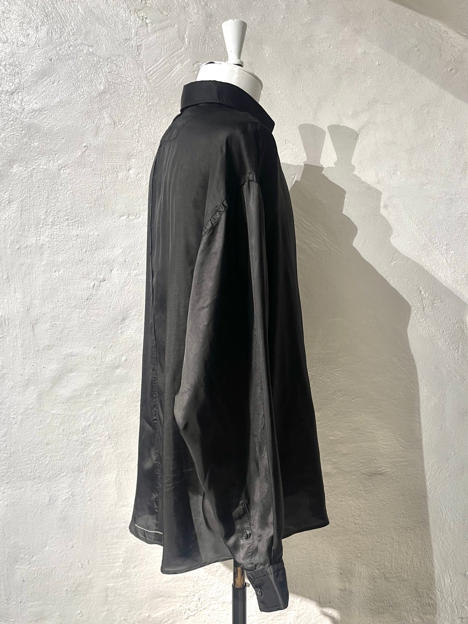 Adnym Atelier Black cupro shirt. Featuring a Classic button down shirt with an oversized and slightly longer fit featuring one narrow chest pocket and vertical seam at back with raw seam allowance visible.