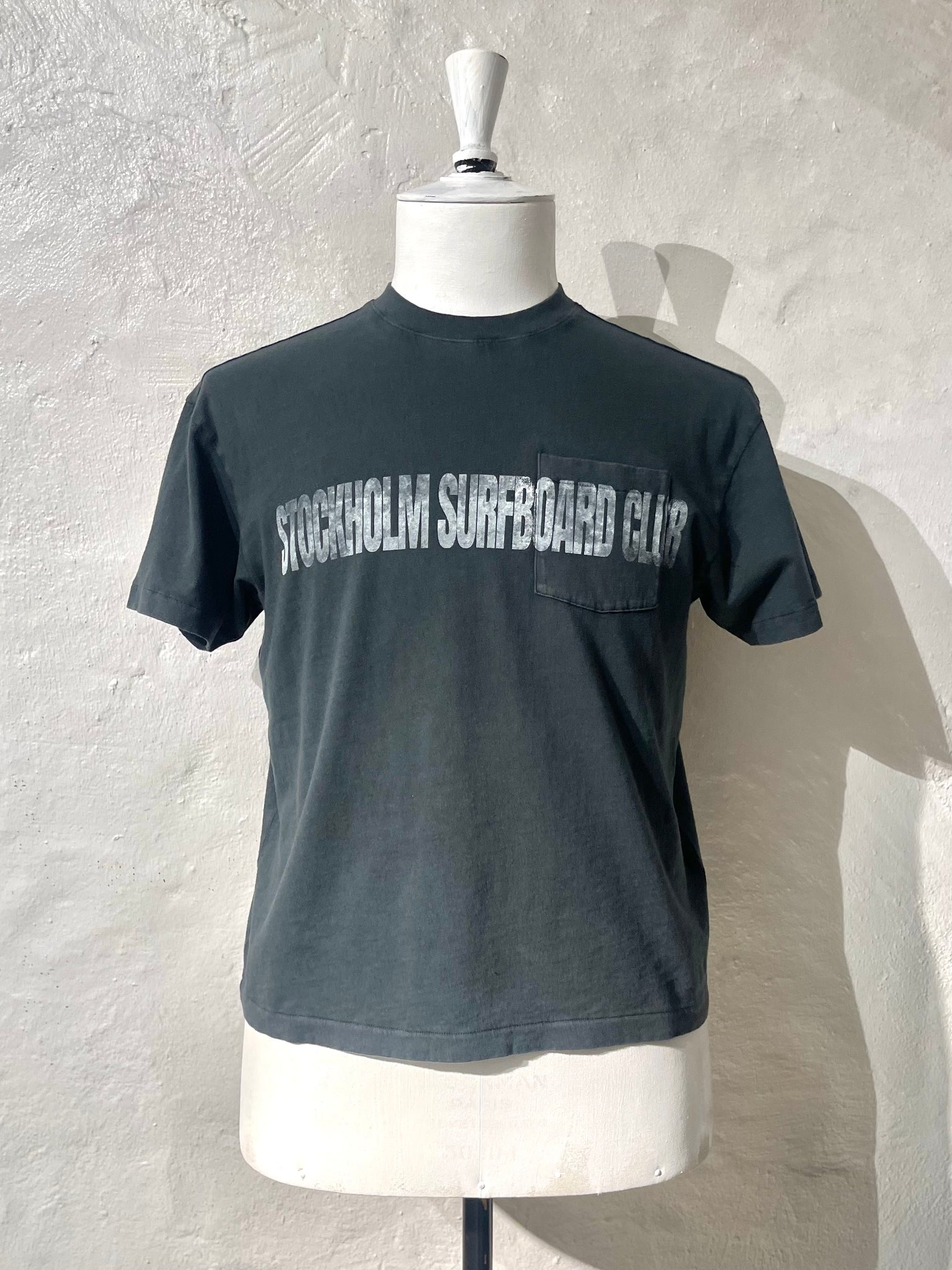 Stockholm Surfboard Club dyed t-shirt. Featuring a chest pocket and screen print, cut in a boxy unisex fit, waist length and rib collar