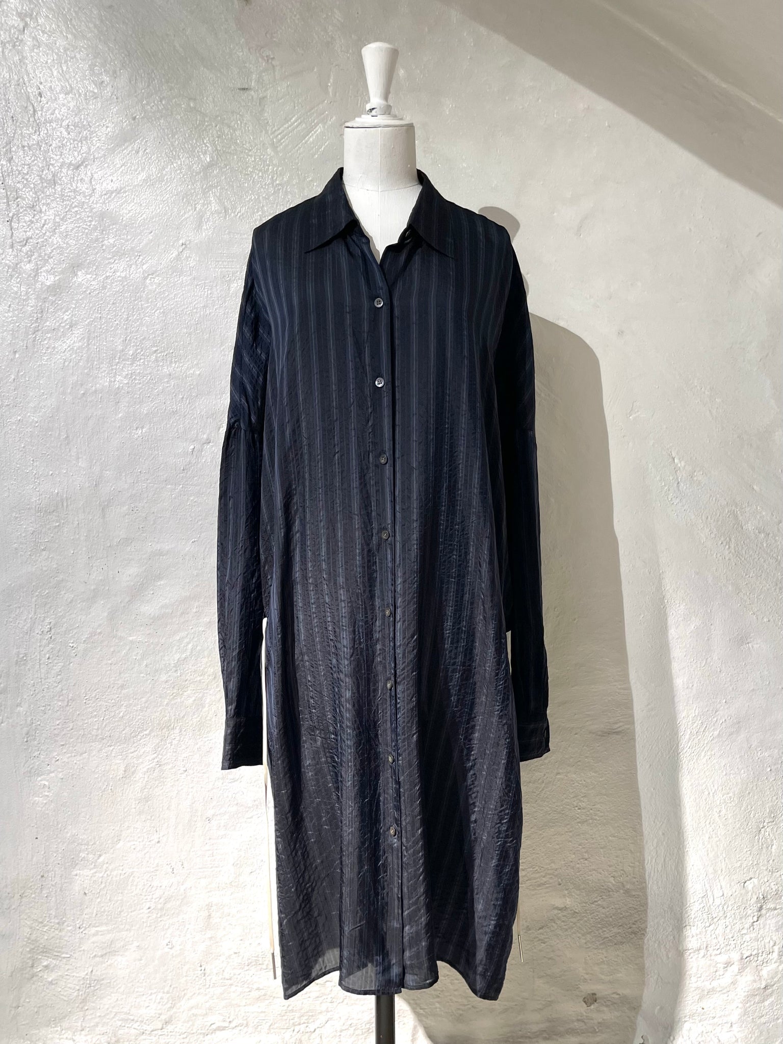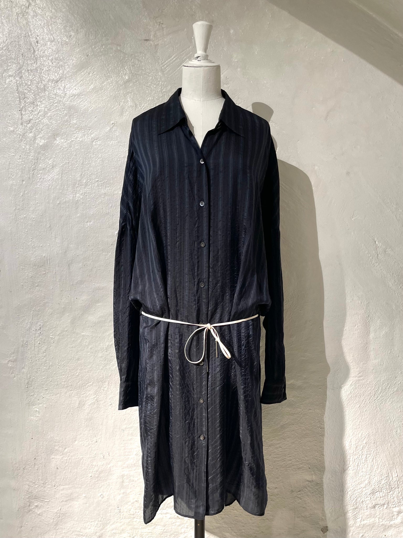 Calf length stripe midnight blue shirt dress with drawstring in the back.