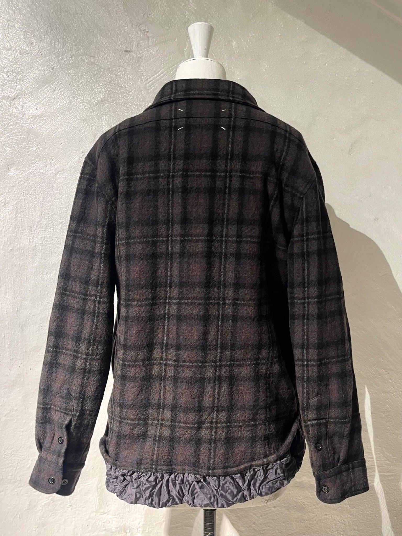 Maison Margiela Quilted shirt-jacket. Featuring a reversible padded shirt-jacket constructed with quilted panels that ripple across the surface, with classic collar and curved hem, diamond-stitched outer with padded structure, button closure through the front, ruched sleeves with contrast cuffs, checked flannel lining at the collar. Four stitches at the back