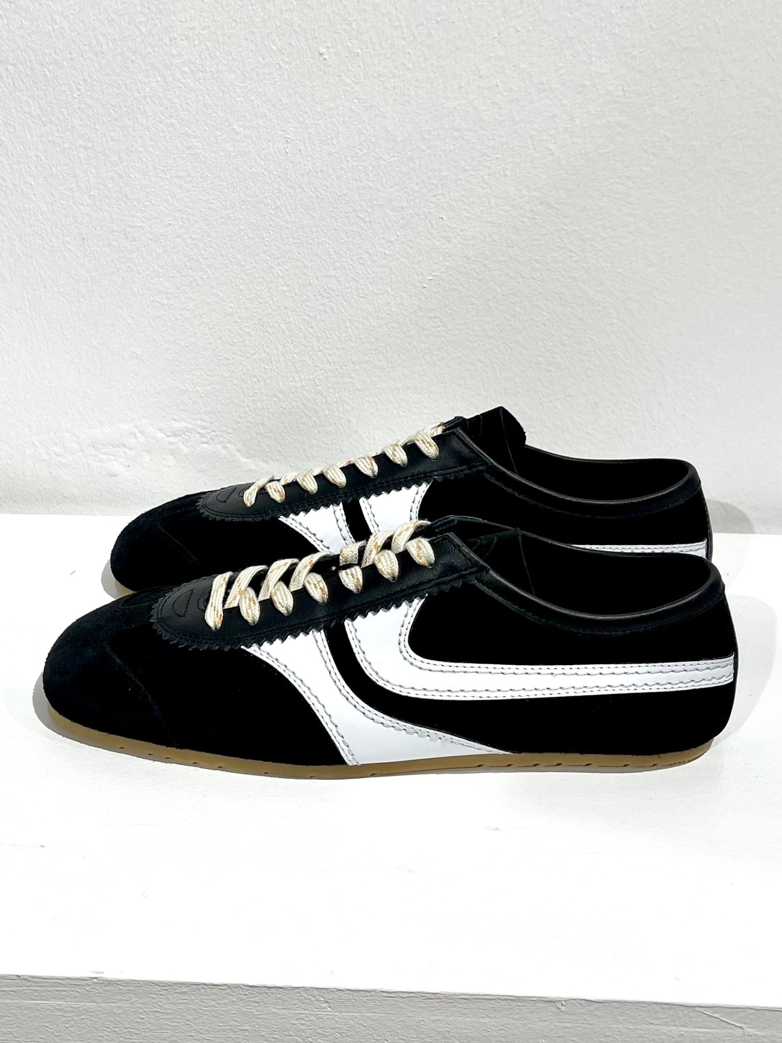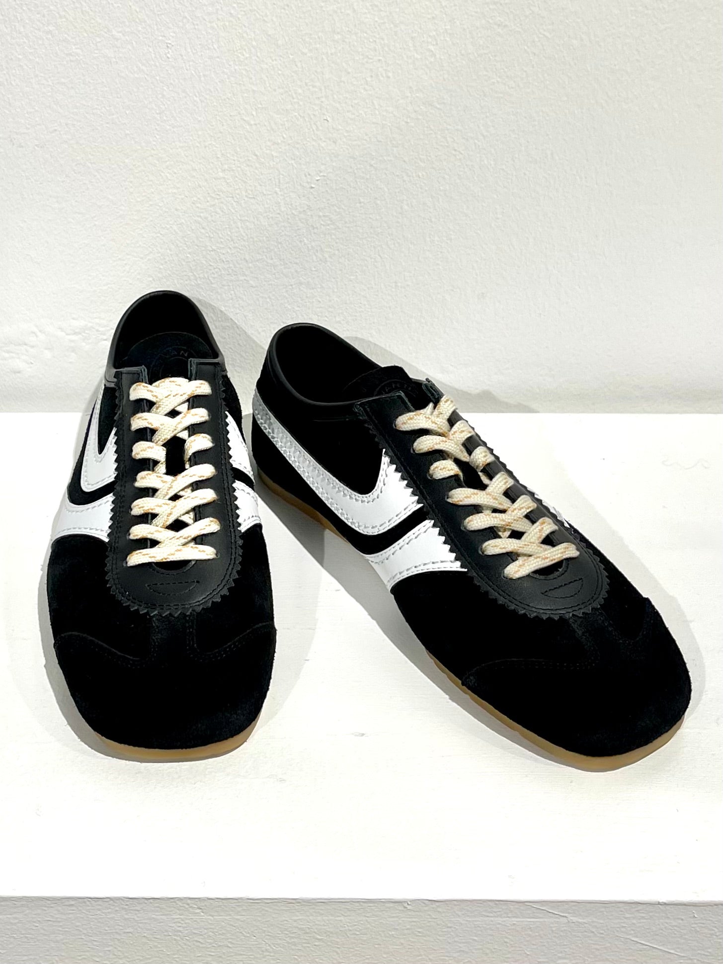 Suede and leather lace ups sneaker flats. Elongated slimmed toebox for added elegance.