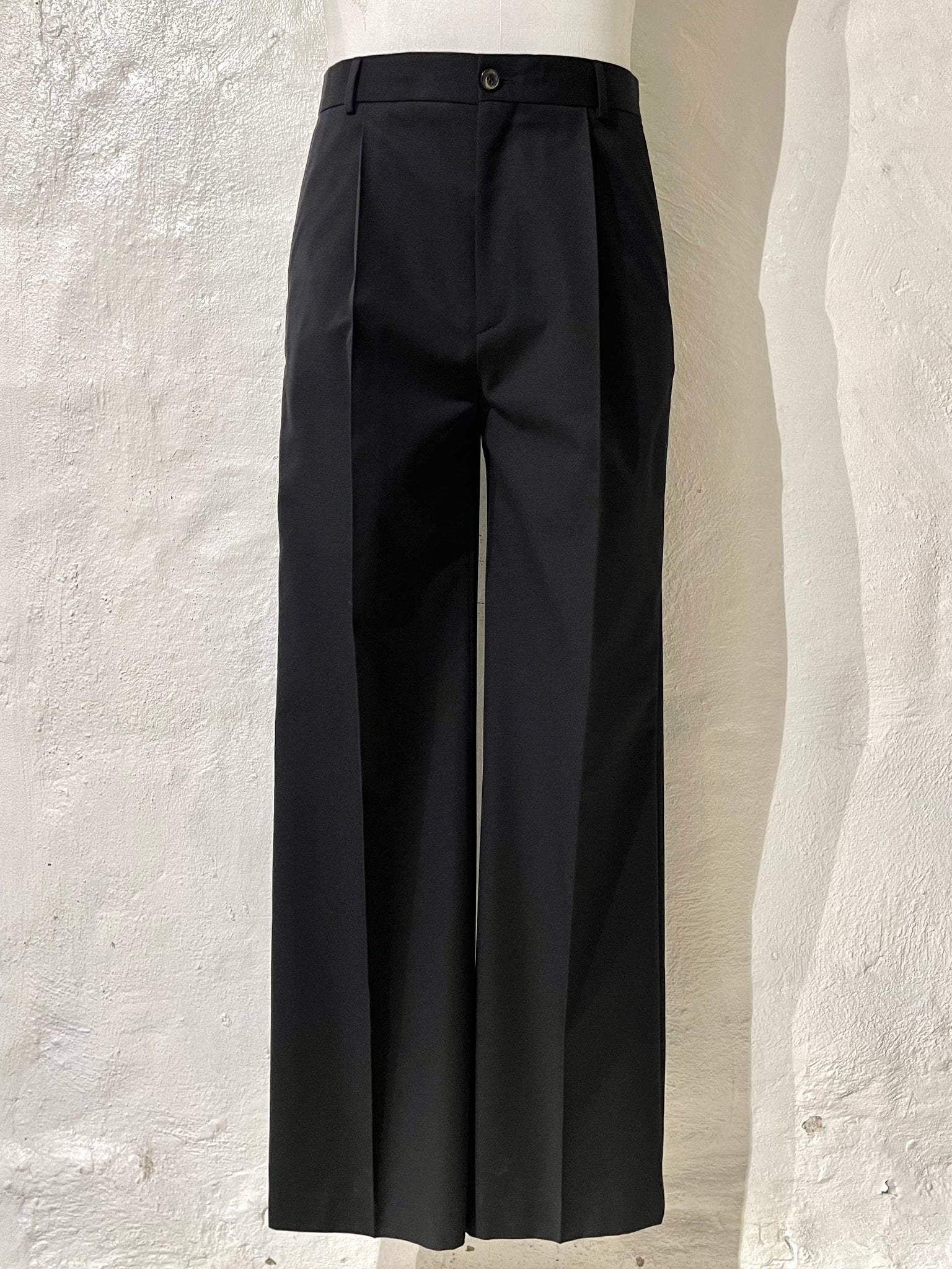 Straight leg pleated mis waist trousers in a cotton/wool blend.