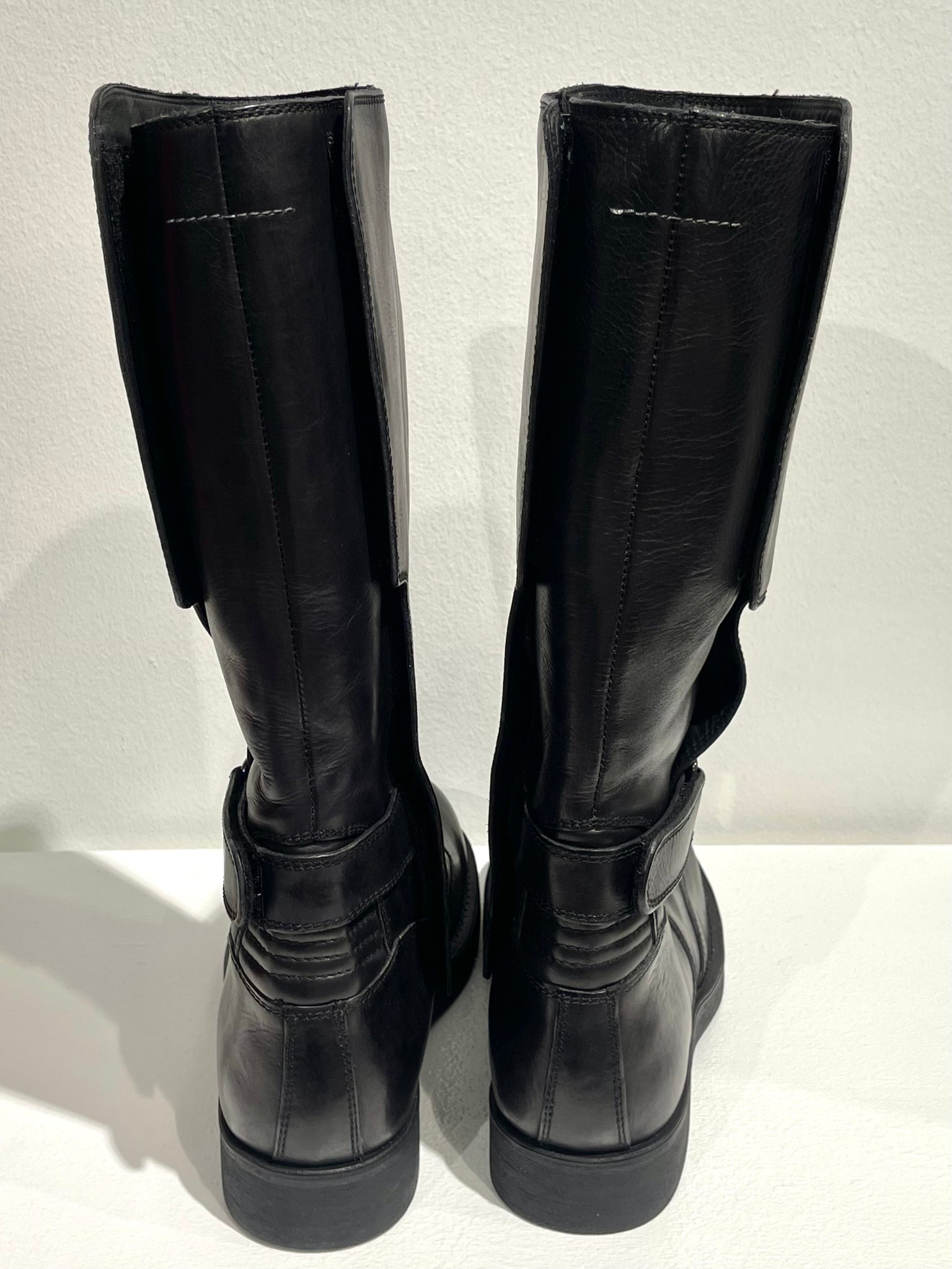Maison Margiela MM6 Black leather biker boots. With buckle detail, contoured stitching, round toe, flat sole