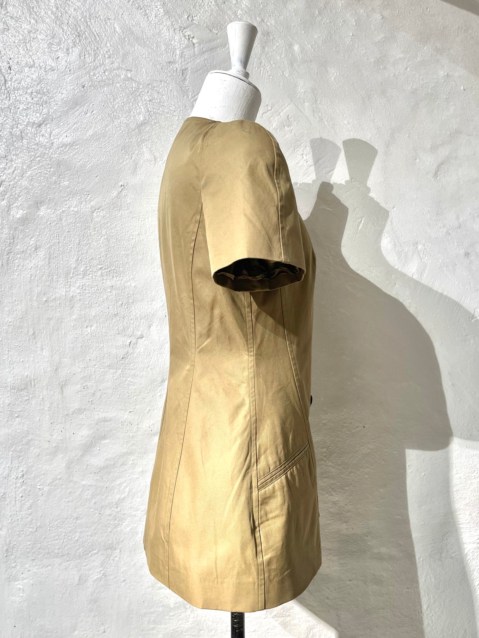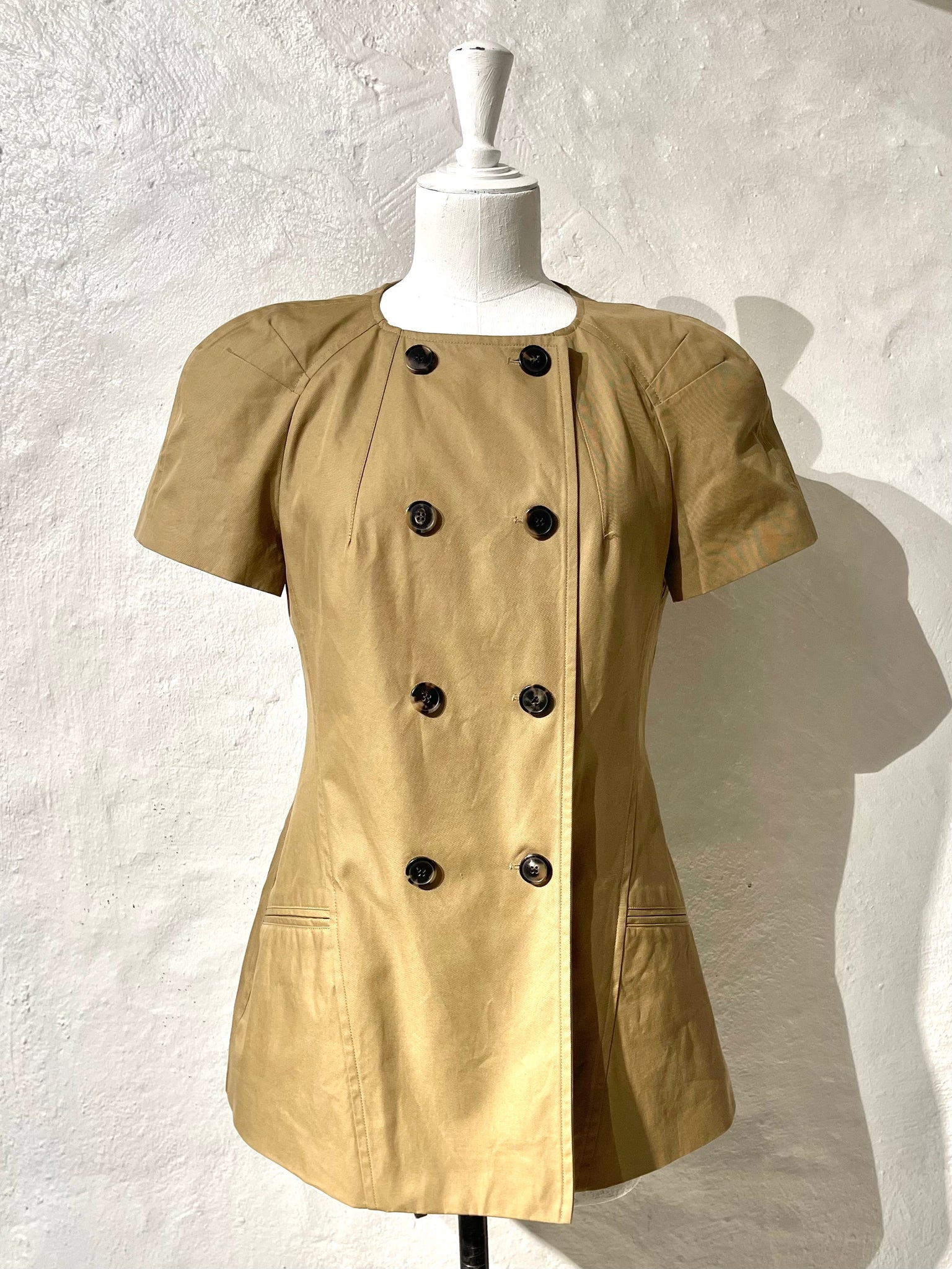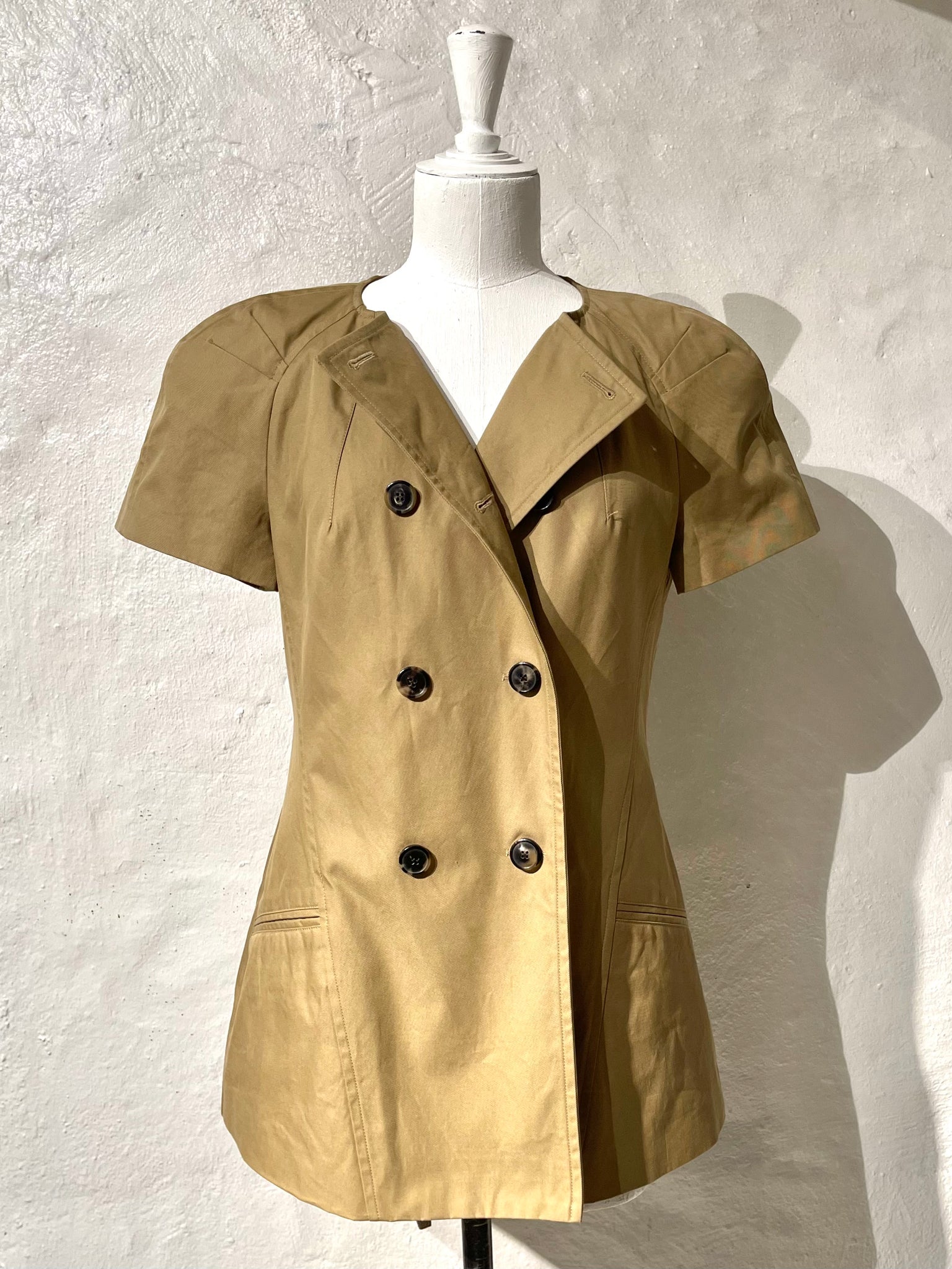 A form fitted jacket that is a new take on the classic trench coat. Short rounded and padded shoulders further accentuate the style.