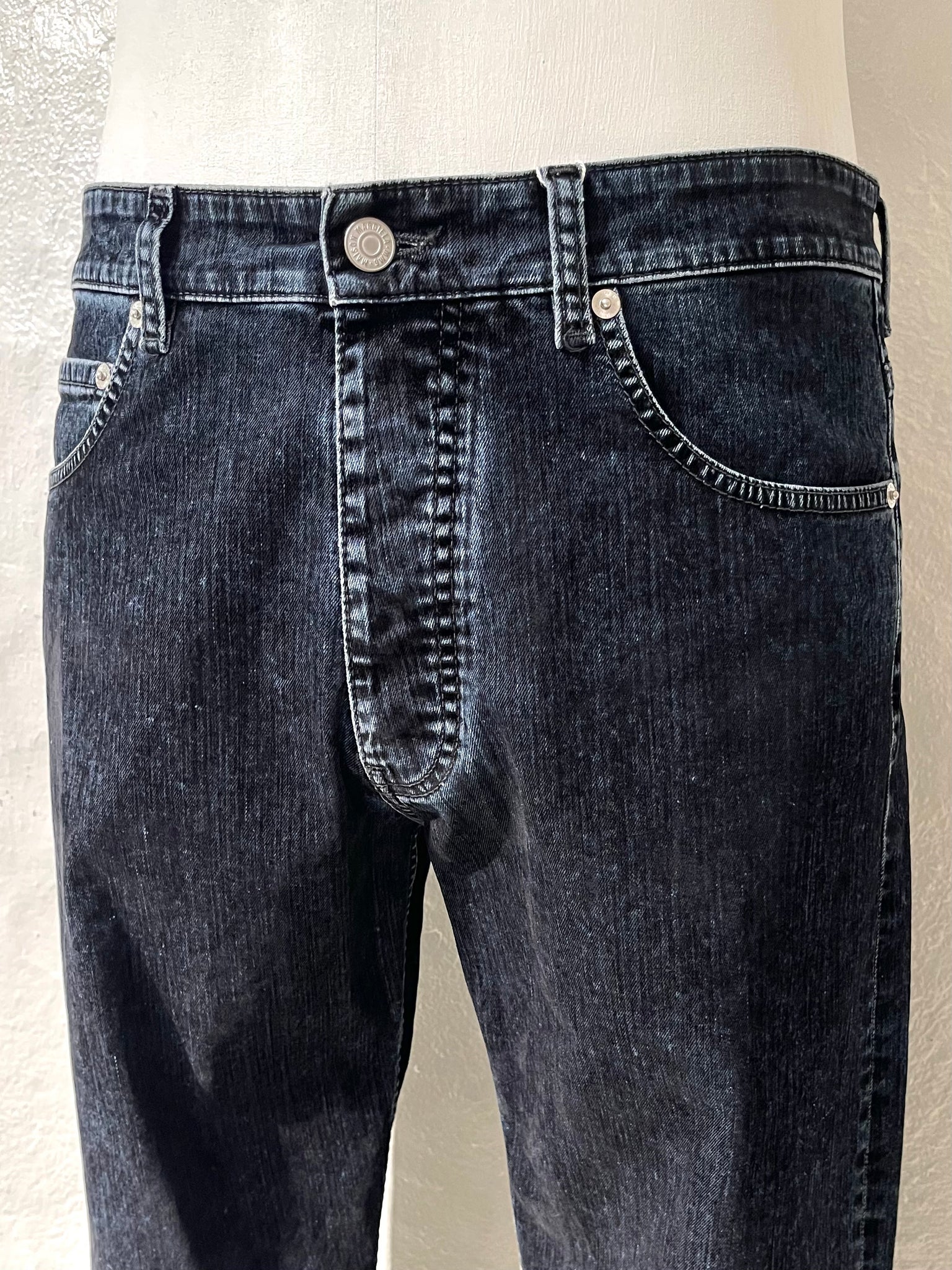Maison Margiela MM6 Flocked Denim Jeans. Featuring a straight leg, five-pocket construction, belt loops, back leather logo patch and white stitch line at the back