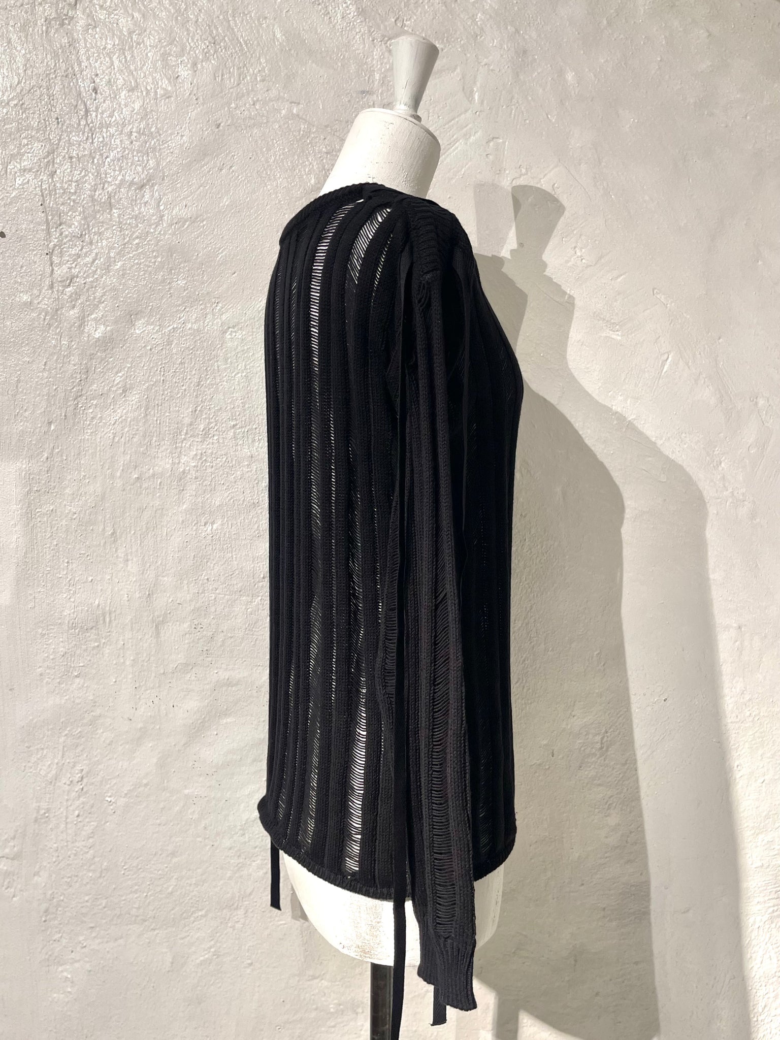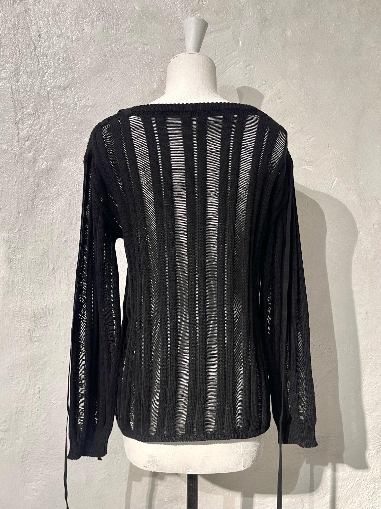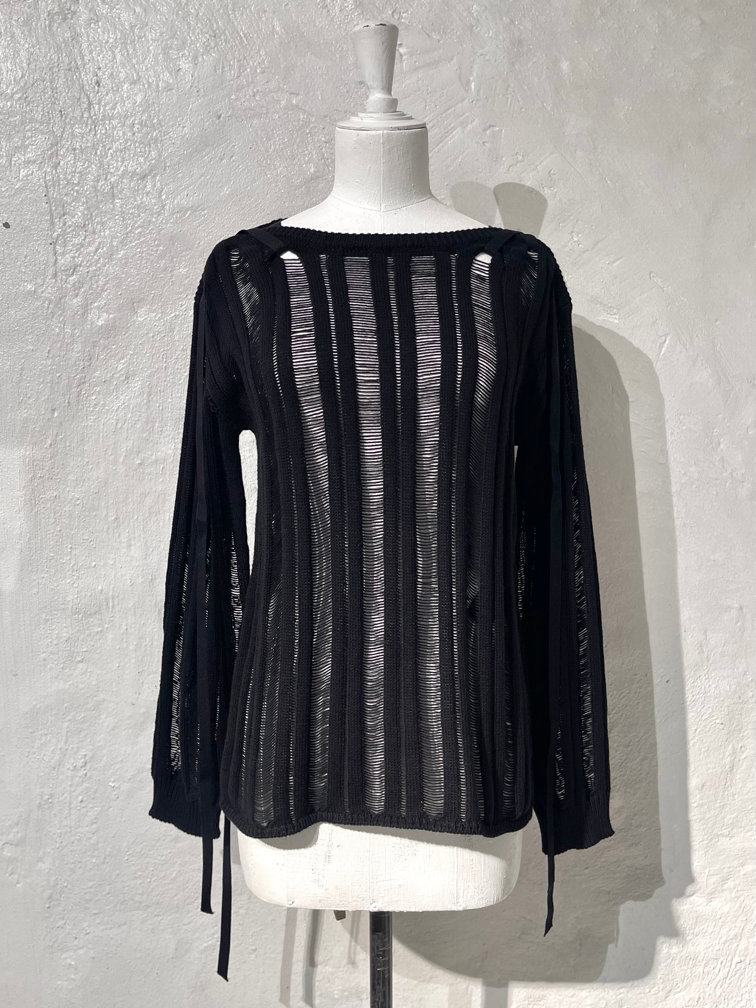 Ladder stitch knit top with adjustable ribbon detail at shoulders.