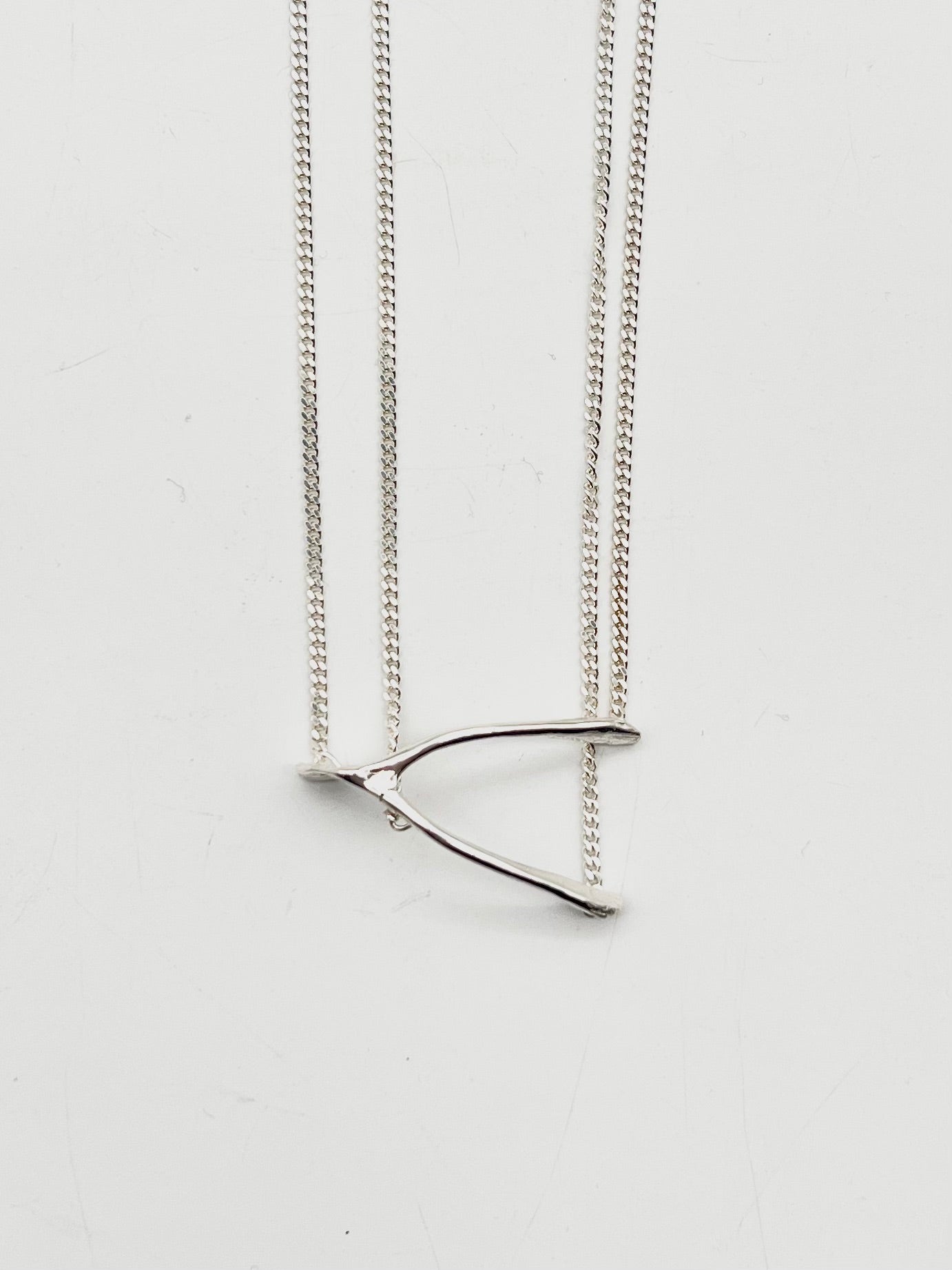 Two thin chains attached to a wishbone. The necklace can be worn in multiple ways or split into two separate items.