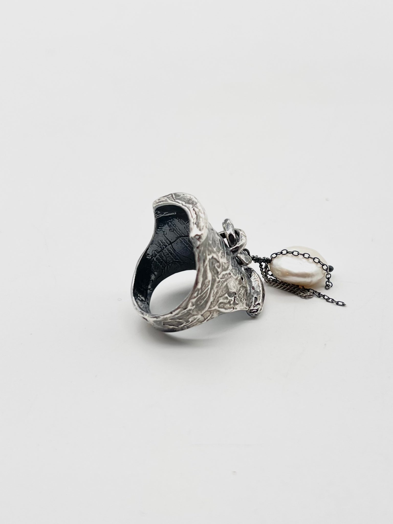 Locked in ring in oxidized silver and a white baroque fresh water pearl