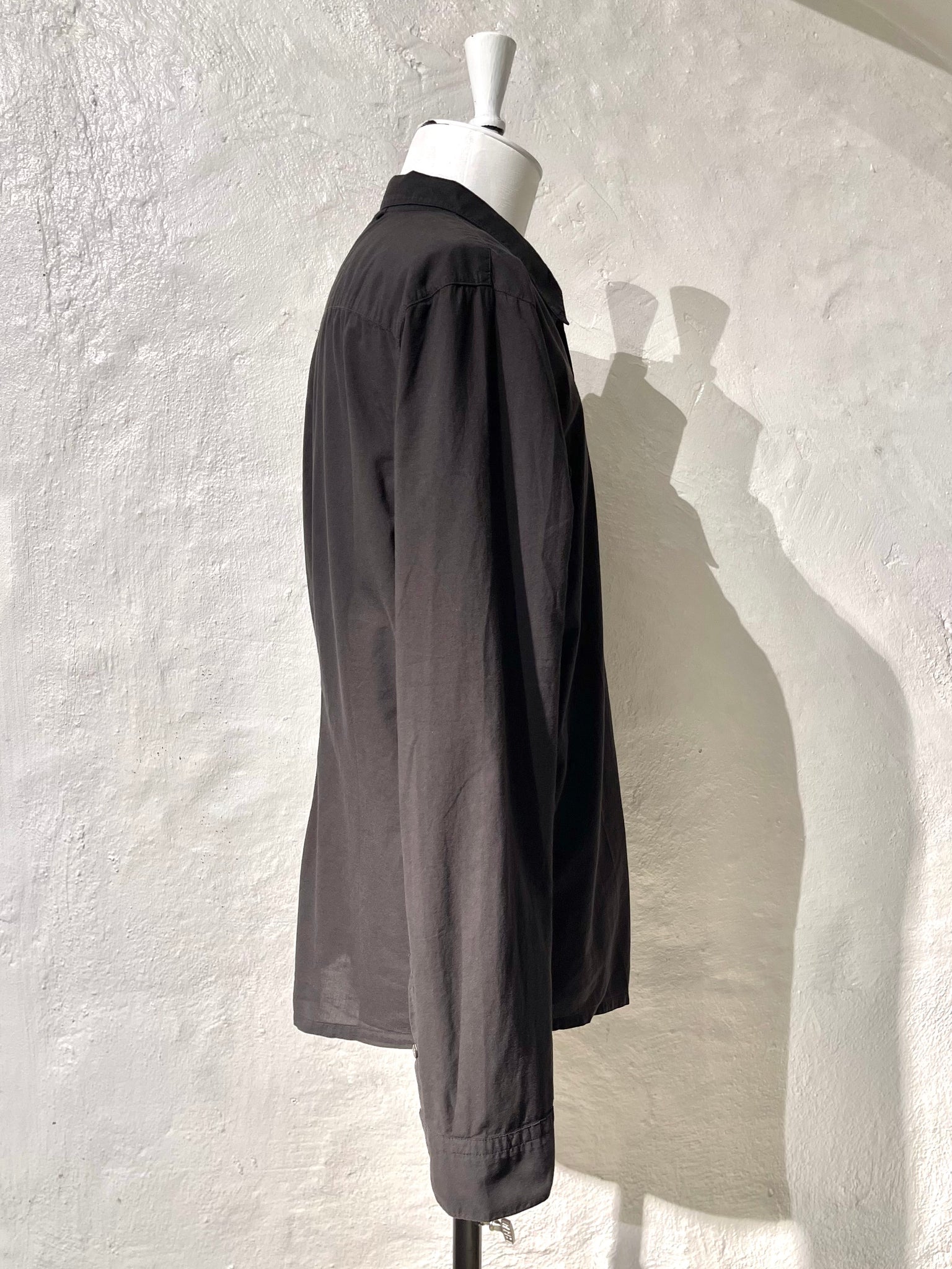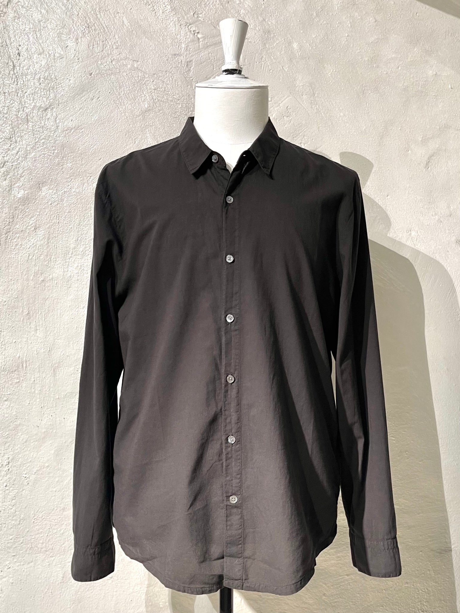 James Perse Standard Shirt is made in 100% cotton that is lightweight and breathable. This fabric is designed using delicate, high count yarns, resulting in a crisp, smooth feel. Style details include a shirt collar, button front closure, full length sleeves with placket at cuffs, back locker loop at neck and a shirttail hem. Garment dyed with extra softeners and silicone for a soft, lived in feel. Classic fit.
